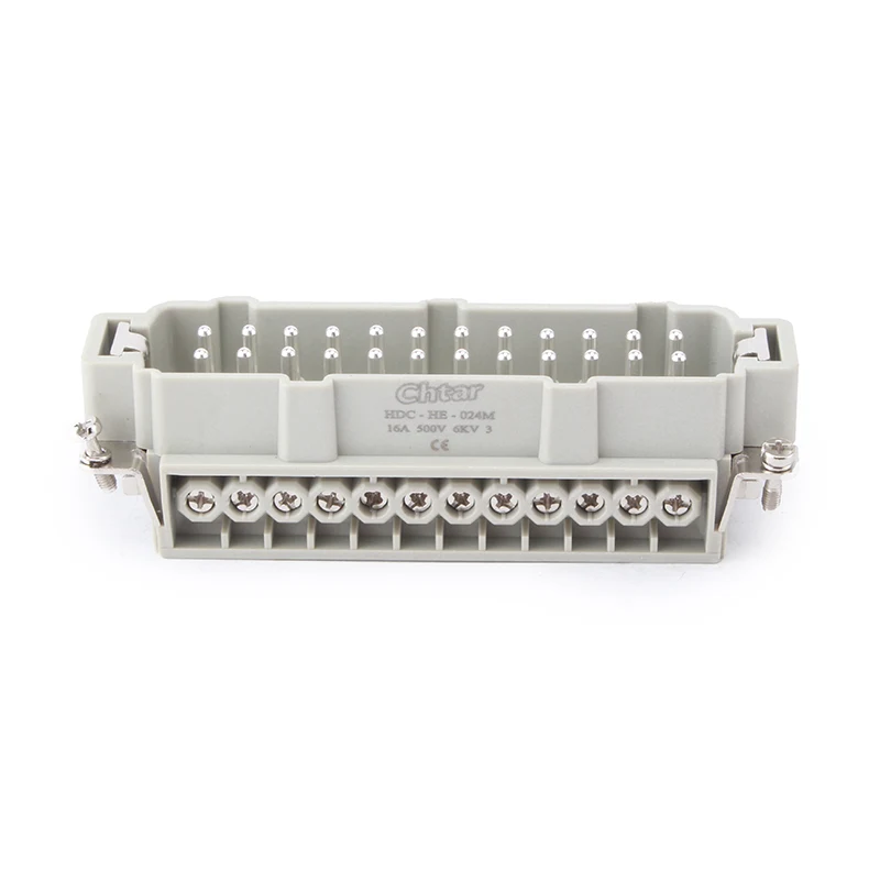 Os conectores pesados ​​de inserção de 24 pinos M/F são peças de inserção de conectores pesados ​​HDC-HE-024. Eles são feitos de PC e pinos de latão. As peças de inserção e as peças da caixa de alumínio são montadas como um conjunto completo de conectores para serviços pesados. As peças de inserção têm função de conexão elétrica e a caixa de alumínio é uma peça de inserção protegida. É até proteção IP65.